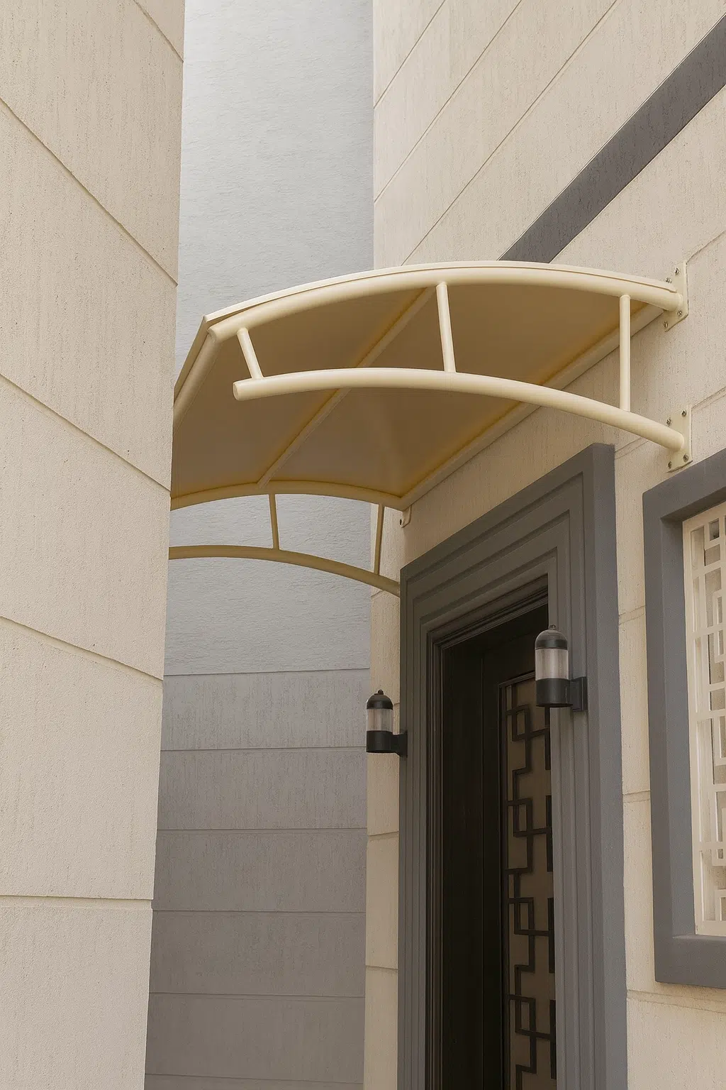 نوصي باستخدام PVC الكوري، البولي كربونيت (اللكسان)، القماش بولي إيثيلين، والأنظمة الكابولية، لأنها تتحمل الحرارة والرطوبة العالية وتدوم لسنوات.